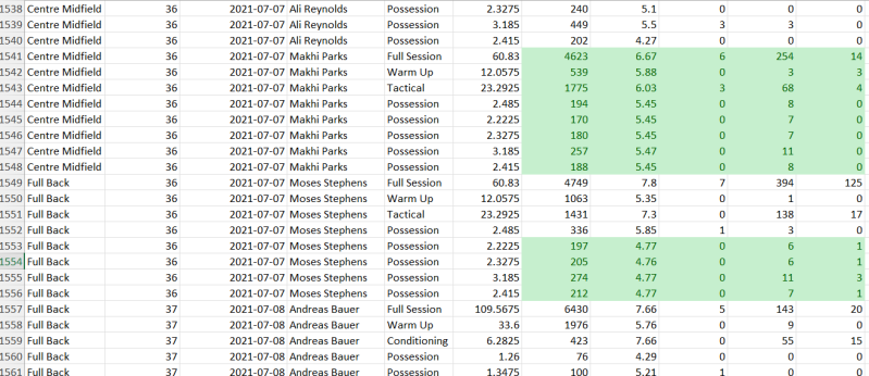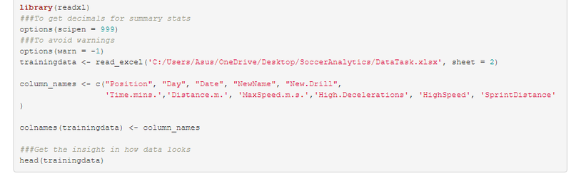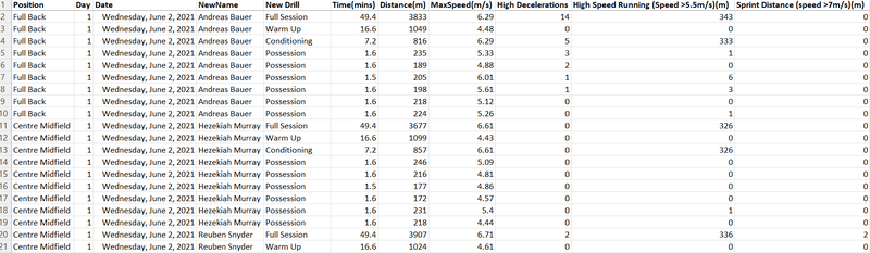 The project involved utilizing the R programming language to analyze datasets comprising 41 days of preseason training data from a professional soccer club. The dataset is structured as follows: