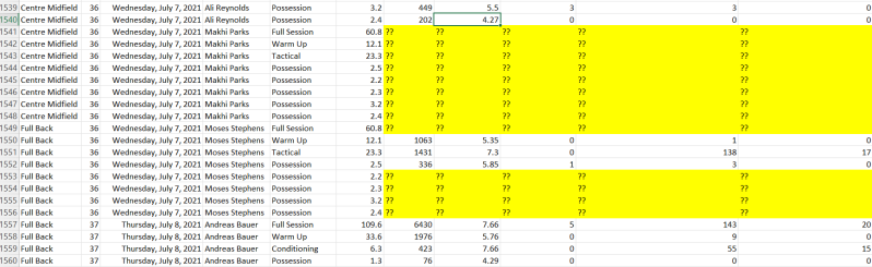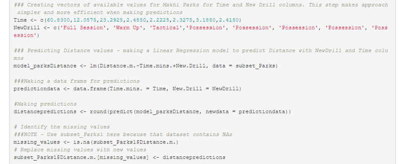 The data collection was conducted using GPS units, and a notable issue arose where the GPS units malfunctioned for certain players on specific days. The objective was to identify and address missing values for two players on a particular training day. The missing values in the dataset appeared as follows: