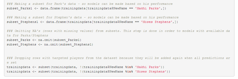 There are several ways to undertake this problem and the decision was to make linear regression models in order to predict the missing values based on previous performance of the players. The other options are: mean value, median value, or mode value.